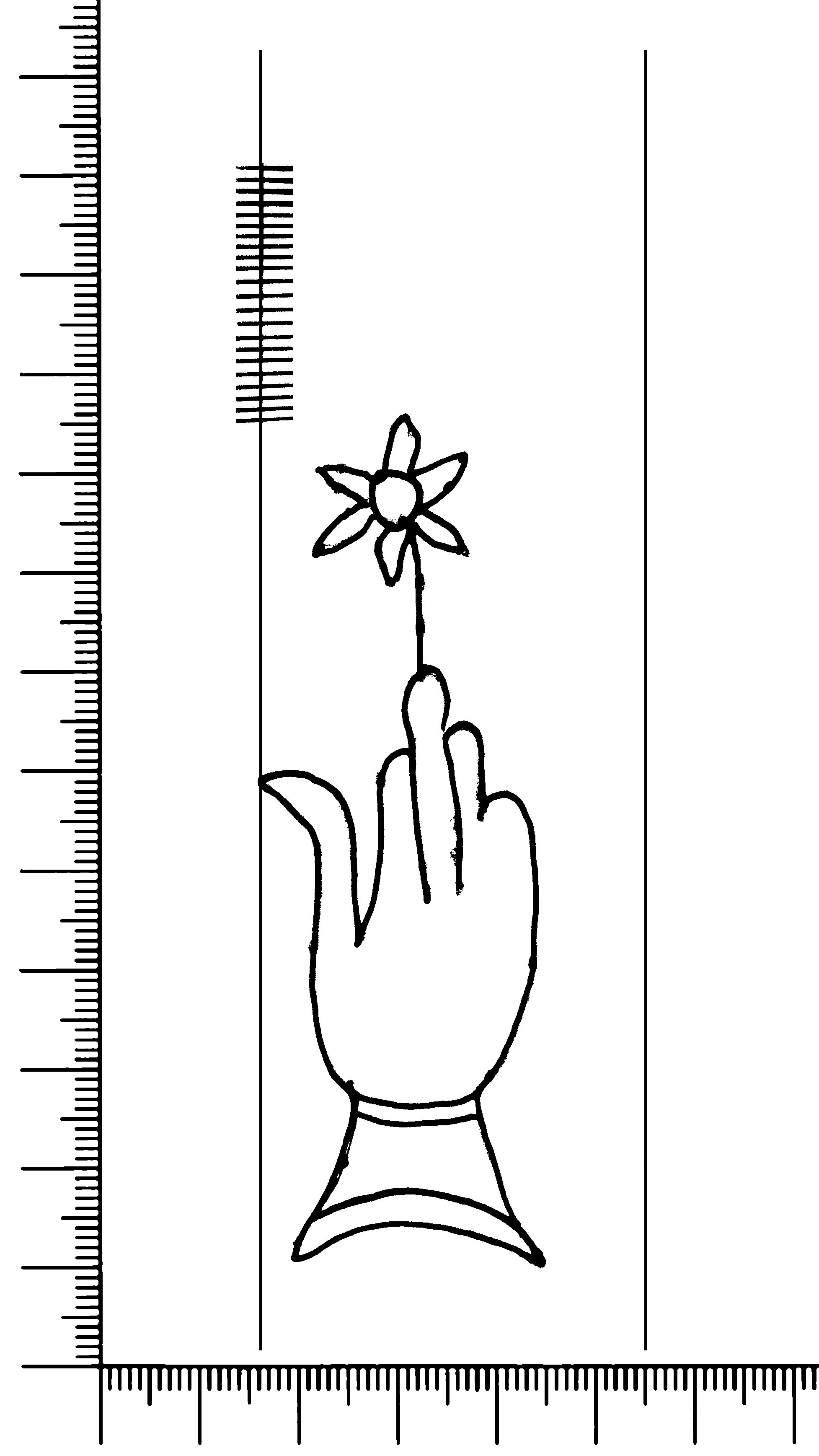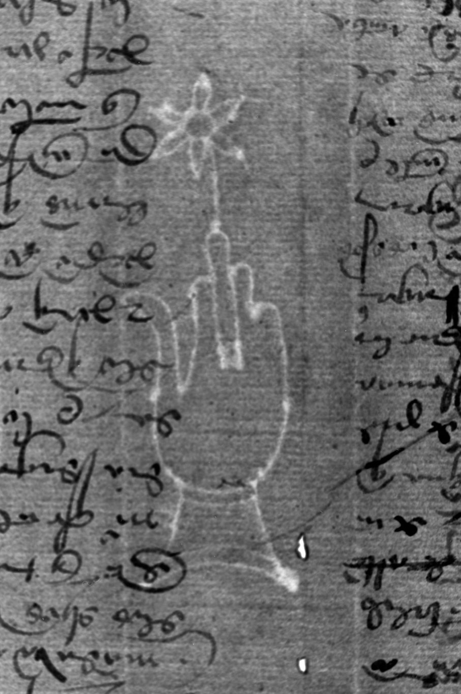 Tipo de filigrana: Sencilla Parte estudiada: Toda la filigrana Código del Motivo: B.02.02.03 Descripción: Mano con cuatro dedos juntos y pulgar separado. Encima flor de seis puntas Estructura: Tradicional de líneas Altura (mm): 87 Anchura (mm): 29 Tipo de papel: Verjurado Posición en la hoja: Medio centro Nº de corondeles en la hoja: 7 Distancia entre corondeles: Situada entre el corondel 3 y el corondel 4 Posición en relación al texto: Perpendicular al texto hacia abajo Origen de los datos: Datos obtenidos del original Información adicional: Son visibles las puntadas que unen la filigrana a la verjura. Se acumula menos pulpa en el corondel de apoyo que en los demás corondeles. Autor de los datos de este registro: María Dolores Díaz de Miranda Macías y Ana María Herrero Estado de la hoja: Cortado borde izquierdo Altura de la hoja: 310 Anchura de la hoja: 223 Color de la hoja: Natural Estado de conservación: Bueno pH del papel: 7,19 (oscila) Institución: Archivo de la Catedral de Oviedo.
