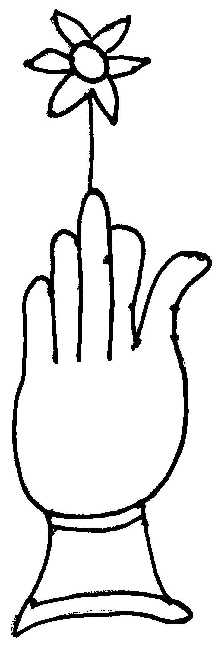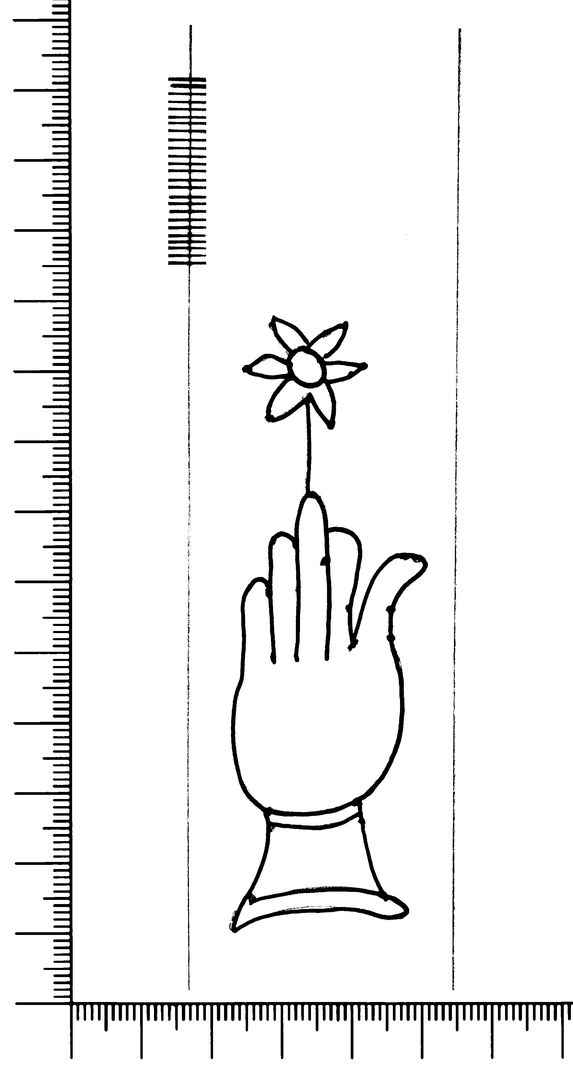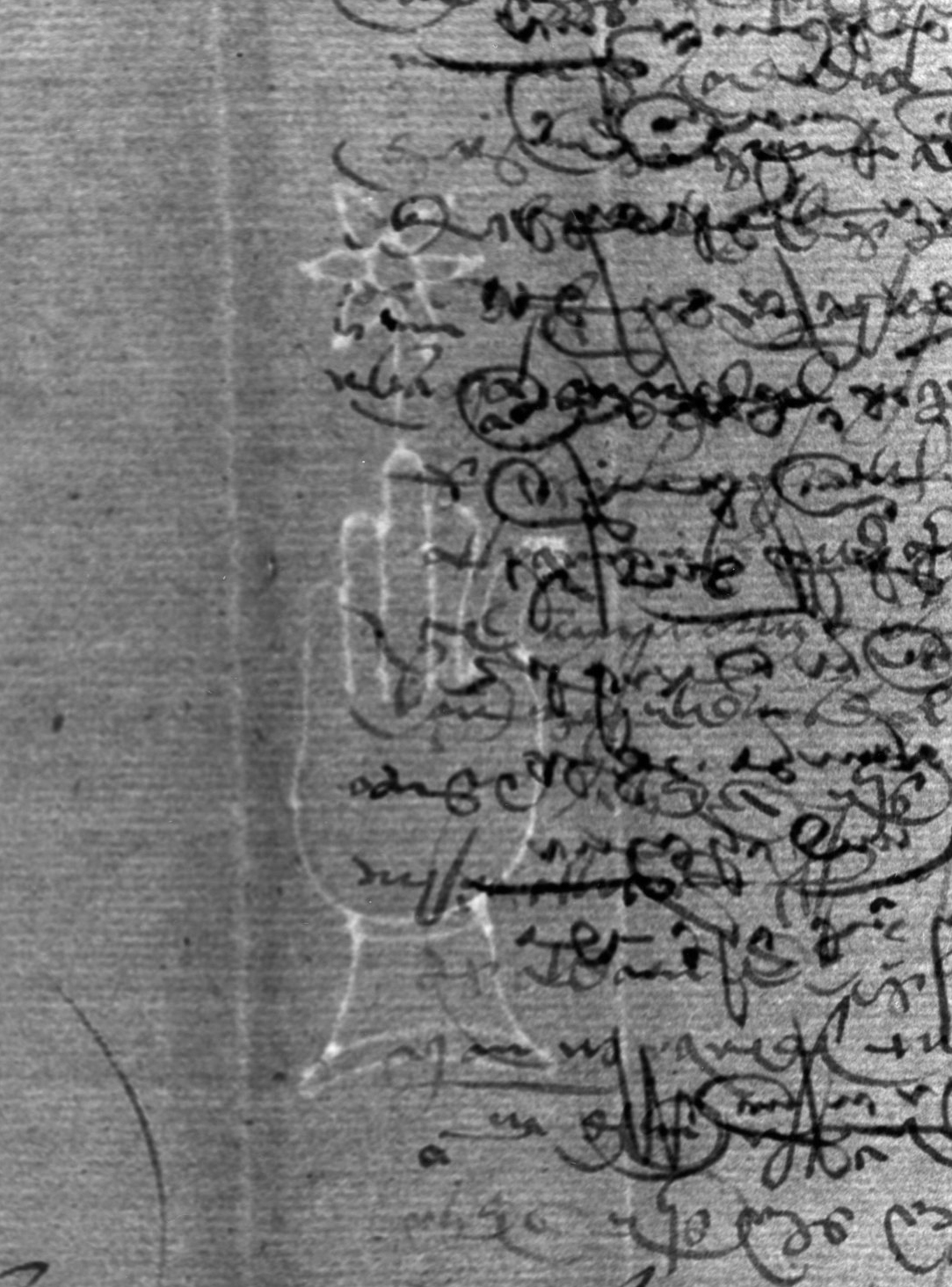Tipo de filigrana: Sencilla Parte estudiada: Toda la filigrana Código del Motivo: B.02.02.03 Descripción: Mano con cuatro dedos juntos y pulgar separado. Encima flor de seis puntas Estructura: Tradicional de líneas Altura (mm): 90 Anchura (mm): 27 Tipo de papel: Verjurado Posición en la hoja: Derecha centro Nº de corondeles en la hoja: 6 Distancia entre corondeles: Situada entre el corondel 4 y el corondel 5 Posición en relación al texto: Perpendicular al texto hacia abajo Origen de los datos: Datos obtenidos del original Información adicional: Son visibles las puntadas que unen la filigrana a la verjura. Se acumula menos pulpa en el corondel de apoyo que en los demás corondeles. Autor de los datos de este registro: María Dolores Díaz de Miranda Macías y Ana María Herrero Estado de la hoja: Cortado borde derecho Altura de la hoja: 310 Anchura de la hoja: 222 Color de la hoja: Natural Estado de conservación: Bueno pH del papel: 7,72 (oscila) Institución: Archivo de la Catedral de Oviedo.