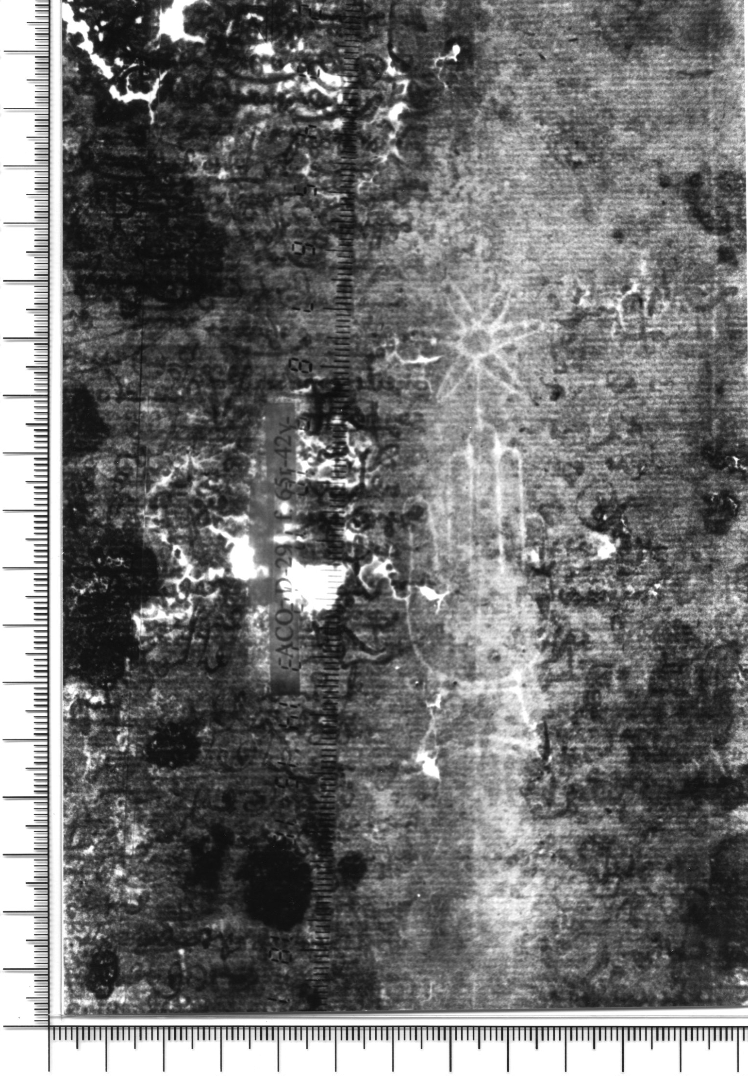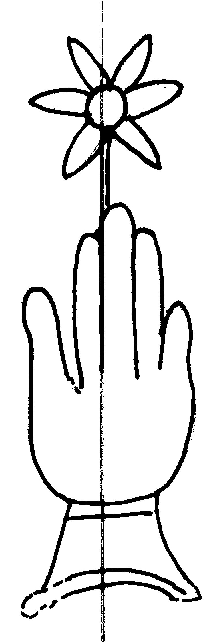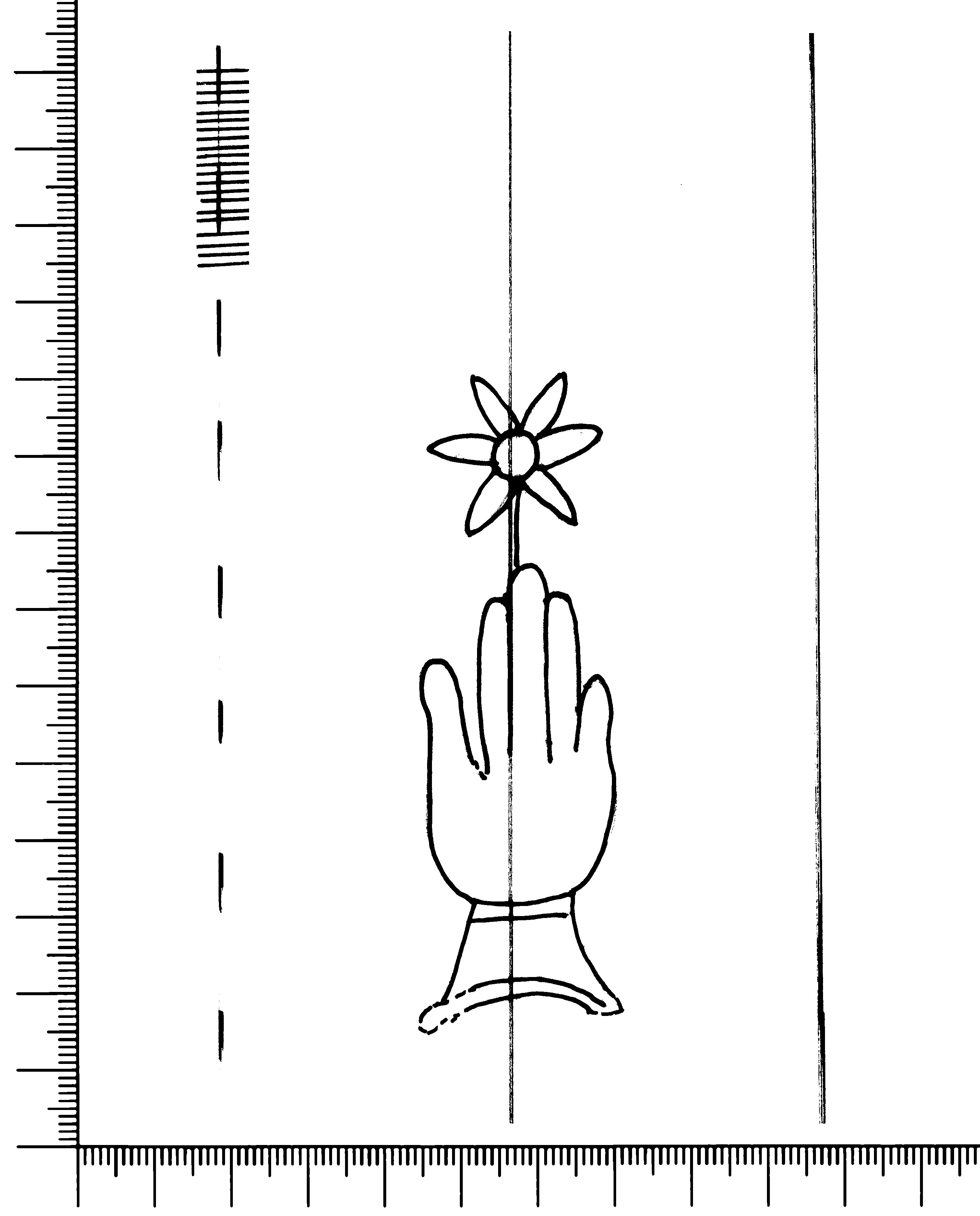 Tipo de filigrana: Sencilla Parte estudiada: Toda la filigrana Código del Motivo: B.02.02.03 Descripción: Mano con cuatro dedos juntos y pulgar separado. Encima flor de seis puntas Estructura: Tradicional de líneas Altura (mm): 87 Anchura (mm): 27 Tipo de papel: Verjurado Posición en la hoja: Medio centro Nº de corondeles en la hoja: 6 Distancia entre corondeles: Situada entre el corondel 2 y el corondel 4 Posición en relación al texto: Perpendicular al texto hacia abajo Origen de los datos: Datos obtenidos del original Información adicional: Son visibles las puntadas que unen la filigrana a la verjura. Autor de los datos de este registro: María Dolores Díaz de Miranda Macías y Ana María Herrero Estado de la hoja: Cortado borde izquierdo Altura de la hoja: 306 Anchura de la hoja: 223 Color de la hoja: Natural Estado de conservación: Malo pH del papel: 6,18 Institución: Archivo de la Catedral de Oviedo.