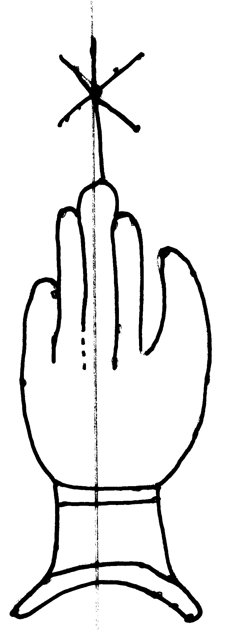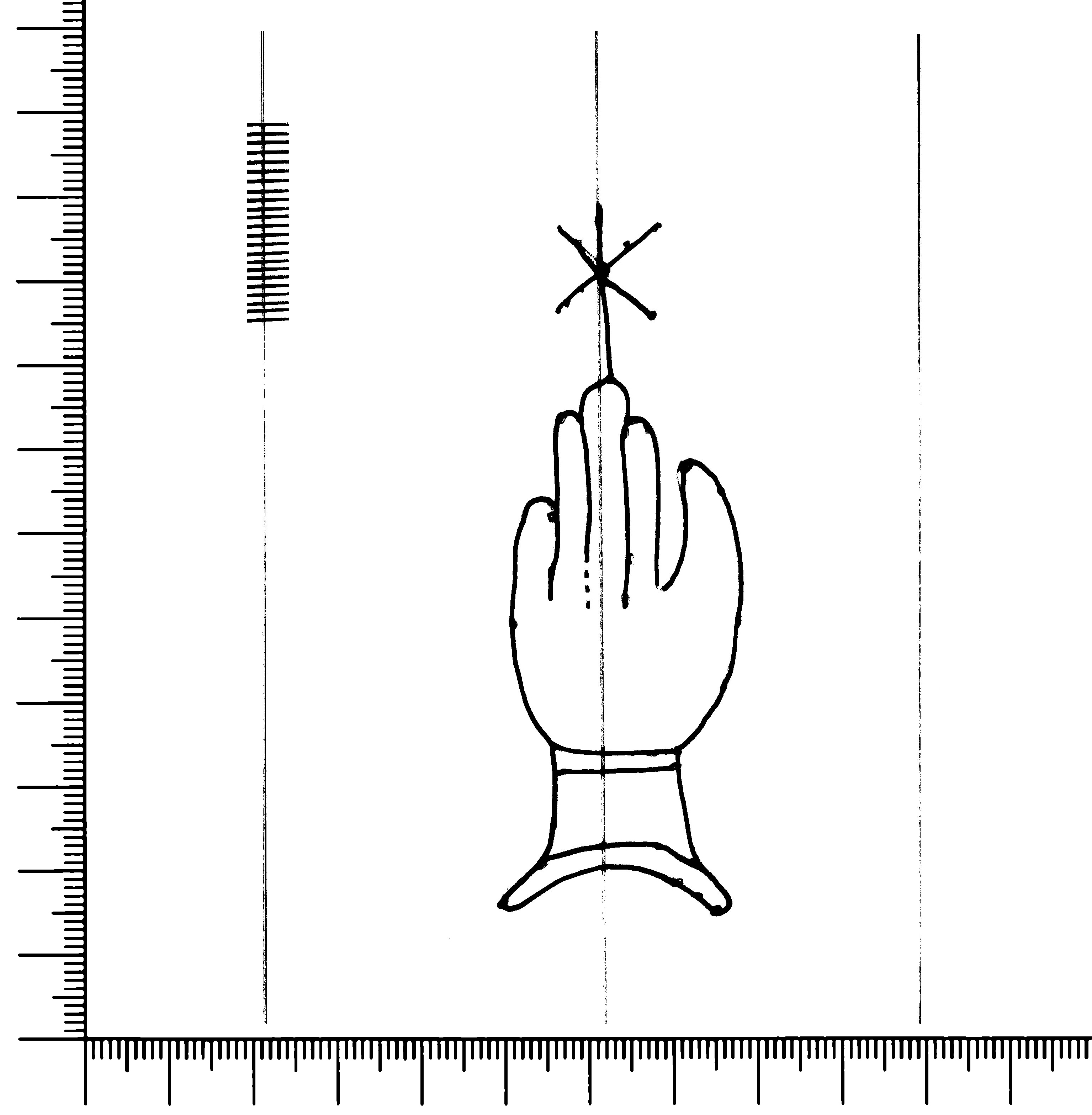Tipo de filigrana: Sencilla Parte estudiada: Toda la filigrana Código del Motivo: B.02.02.04 Descripción: Mano con cuatro dedos juntos y pulgar separado. Encima cruz en aspa Estructura: Tradicional de líneas Altura (mm): 86 Anchura (mm): 29 Tipo de papel: Verjurado Posición en la hoja: Medio centro Nº de corondeles en la hoja: 6 Distancia entre corondeles: Situada entre el corondel 2 y el corondel 4 Posición en relación al texto: Perpendicular al texto hacia arriba Origen de los datos: Datos obtenidos del original Información adicional: Son visibles las puntadas que unen la filigrana a la verjura. Autor de los datos de este registro: María Dolores Díaz de Miranda Macías y Ana María Herrero Estado de la hoja: Cortado borde izquierdo Altura de la hoja: 316 Anchura de la hoja: 224 Color de la hoja: Natural Estado de conservación: Malo pH del papel: 6,19 Institución: Archivo de la Catedral de Oviedo.