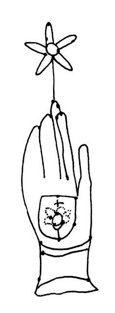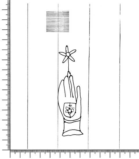 Tipo de filigrana: Sencilla Parte estudiada: Toda la filigrana Código del Motivo: B.02.03.00 Descripción: Mano con flor y escudo en su interior. Estructura: Tradicional de líneas Altura (mm): 92 Anchura (mm): 26 Tipo de papel: Verjurado Posición en la hoja: Izquierda centro Nº de corondeles en la hoja: 13 Distancia entre corondeles: Situada entre el corondel 3 y el corondel 4 Posición en relación al texto: Perpendicular al texto hacia arriba Origen de los datos: Datos obtenidos del original Información adicional: Son visibles las puntadas que unen la filigrana a la verjura. Autor de los datos de este registro: María Dolores Díaz de Miranda Macías Tipo de uso: Papel para escribir Estado de la hoja: Cortado borde izquierdo, superior y derecho Altura de la hoja: 307 Anchura de la hoja: 418 Color de la hoja: Natural Estado de conservación: Regular pH del papel: 6,17 (oscila) Indicador de pH: Indicador universal Institución: RIDEA