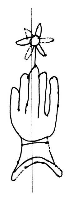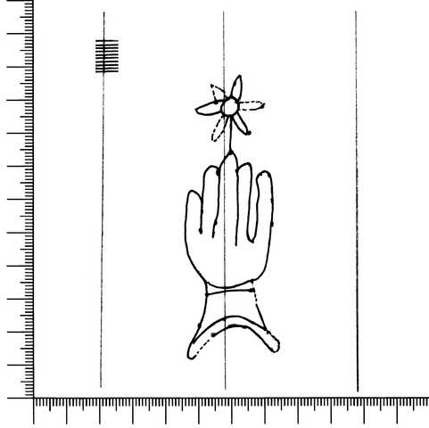 Tipo de filigrana: Sencilla Parte estudiada: Toda la filigrana Código del Motivo: B.02.02.03 Descripción: Mano con flor. Estructura: Tradicional de líneas Altura (mm): 86 Anchura (mm): 28 Tipo de papel: Verjurado Posición en la hoja: Izquierda centro Nº de corondeles en la hoja: 6 Distancia entre corondeles: Situada entre el corondel 1 y el corondel 3 Posición en relación al texto: Paralelo al texto en el mismo sentido Origen de los datos: Datos obtenidos del original Información adicional: Son visibles las puntadas que unen la filigrana a la verjura. No se distingue bien el corondel de apoyo. Tipo de uso: Papel para escribir Estado de la hoja: Cortado borde izquierdo Altura de la hoja: 313 Anchura de la hoja: 218 Color de la hoja: Natural Estado de conservación: Regular pH del papel: 7,38 Indicador de pH: Indicador universal Institución: RIDEA