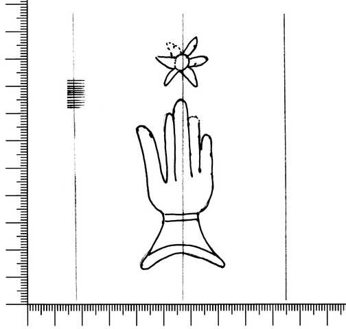 Tipo de filigrana: Sencilla Parte estudiada: Toda la filigrana Código del Motivo: B.02.02.03 Descripción: Mano con flor. Estructura: Tradicional de líneas Altura (mm): 86 Anchura (mm): 32 Tipo de papel: Verjurado Posición en la hoja: Derecha centro Nº de corondeles en la hoja: 6 Distancia entre corondeles: Situada entre el corondel 4 y el corondel 6 Posición en relación al texto: Paralelo al texto en sentido contrario Origen de los datos: Datos obtenidos del original Información adicional: Son visibles las puntadas que unen la filigrana a la verjura. No se distingue bien el corondel de apoyo; se ven muy mal los corondeles y puntizones. Se acumula pulpa entre el corondel de apoyo y el borde externo de la hoja. Autor de los datos de este registro: María Dolores Díaz de Miranda Macías y Ana María Herrero Montero Tipo de uso: Papel para escribir Estado de la hoja: Cortado borde derecho y superior Altura de la hoja: 314 Anchura de la hoja: 220 Color de la hoja: Natural Estado de conservación: Regular pH del papel: 7,30 (oscila) Indicador de pH: Indicador universal Institución: RIDEA