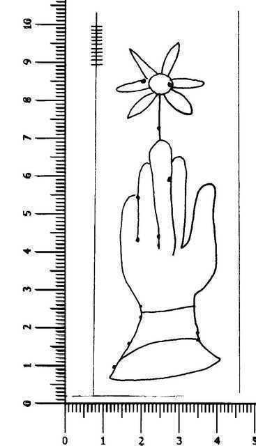 Tipo de filigrana: Sencilla Parte estudiada: Toda la filigrana Código del Motivo: B.02.02.03 Descripción: Mano con cinco dedos, el pulgar ligeramente separado, sobre el dedo medio una flor de seis pétalos Estructura: Tradicional de líneas Altura (mm): 89 Anchura (mm): 28 Tipo de papel: Verjurado Posición en la hoja: Derecha centro Nº de corondeles en la hoja: 11 Distancia entre corondeles: 19-40-40-37-39-39-39-41-(37)-40-37-19 Situada entre el corondel 8 y el corondel 9 Posición en relación al texto: Origen de los datos: Datos obtenidos del original Autor de los datos de este registro: María Dolores Díaz de Miranda Macías y Ana María Herrero Montero Tipo de uso: Papel para escribir Estado de la hoja: Cortados todos los bordes Altura de la hoja: 302 Anchura de la hoja: 427 Color de la hoja: Natural Institución: Archivo de la Catedral de Oviedo.