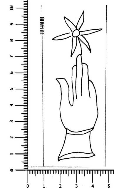 Tipo de filigrana: Sencilla Parte estudiada: Toda la filigrana Código del Motivo: B.02.02.03 Descripción: Mano con cinco dedos, el pulgar separado, sobre el dedo medio una gran flor de seis pétalos Estructura: Tradicional de líneas Altura (mm): 93 Anchura (mm): 26 Tipo de papel: Verjurado Posición en la hoja: Izquierda centro Nº de corondeles en la hoja: 11 Distancia entre corondeles: 16-40-37-(39)-39-39-38-39-39-39-36-19 Situada entre el corondel 3 y el corondel 4 Posición en relación al texto: Origen de los datos: Datos obtenidos del original Autor de los datos de este registro: María Dolores Díaz de Miranda Macías Tipo de uso: Papel para escribir Estado de la hoja: Cortados todos los bordes Altura de la hoja: 305 Anchura de la hoja: 420 Color de la hoja: Natural Institución: Archivo de la Catedral de Oviedo.