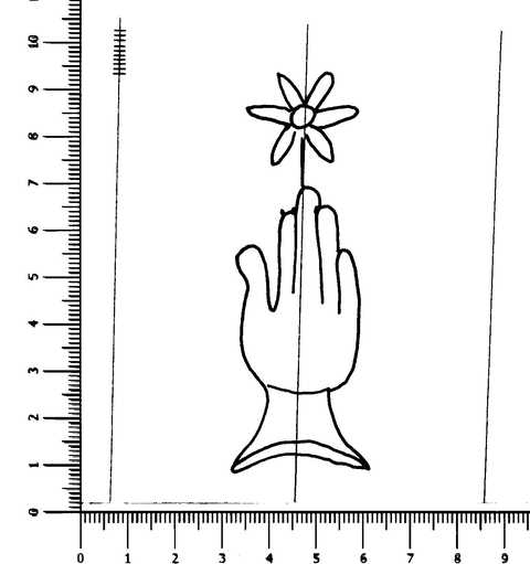 Tipo de filigrana: Sencilla Parte estudiada: Toda la filigrana Código del Motivo: B.01.02.03 Descripción: Mano con cinco dedos, el pulgar separado, sobre el dedo medio una gran flor de seis pétalos Estructura: Tradicional de líneas Altura (mm): 86 Anchura (mm): 30 Tipo de papel: Verjurado Posición en la hoja: Derecha centro Nº de corondeles en la hoja: 11 Distancia entre corondeles: 20-39-39-39-39-37-38-37-(39)-(40)-38-15 Situada entre el corondel 8 y el corondel 10 Posición en relación al texto: Origen de los datos: Datos obtenidos del original Autor de los datos de este registro: María Dolores Díaz de Miranda Macías Tipo de uso: Papel para escribir Estado de la hoja: Cortados todos los bordes Altura de la hoja: 305 Anchura de la hoja: 420 Color de la hoja: Natural Institución: Archivo de la Catedral de Oviedo.