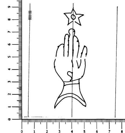 Tipo de filigrana: Sencilla Parte estudiada: Toda la filigrana Código del Motivo: B.02.04.05 Descripción: Mano con cinco dedos, el pulgar separado, sobre el dedo medio una flor de cinco pétalos y en la región metacarpiana una P invertida Estructura: Tradicional de líneas Altura (mm): 80 Anchura (mm): 27 Tipo de papel: Verjurado Posición en la hoja: Medio centro Nº de corondeles en la hoja: 7 Distancia entre corondeles: 5-35-35-(35)-(35)-35-14 Situada entre el corondel 3 y el corondel 5 Posición en relación al texto: Origen de los datos: Datos obtenidos del original Autor de los datos de este registro: María Dolores Díaz de Miranda Macías Tipo de uso: Papel para escribir Estado de la hoja: Cortados todos los bordes Altura de la hoja: 274 Anchura de la hoja: 194 Color de la hoja: Natural Institución: Archivo de la Catedral de Oviedo.