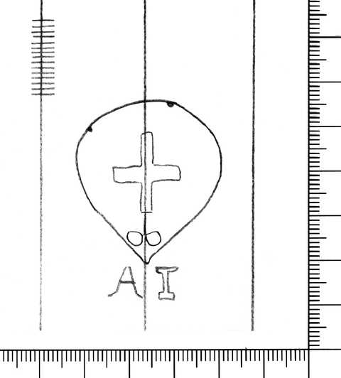 Tipo de filigrana: Sencilla Parte estudiada: Toda la filigrana Código del Motivo: S.01.03.03 Descripción: Cruz dentro de un óvalo con forma de corazón. Debajo, las letras AI. Estructura: Tradicional de líneas Altura (mm): 41 Anchura (mm): Tipo de papel: Vitela Posición en la hoja: Izquierda superior Nº de corondeles en la hoja: 10 Distancia entre corondeles: Situada entre el corondel 2 y el corondel 4 Posición en relación al texto: Perpendicular al texto hacia abajo Origen de los datos: Datos obtenidos del original Estado de la hoja: Cortados todos los bordes Altura de la hoja: 210 Anchura de la hoja: 316 Color de la hoja: Natural Estado de conservación: Bueno Institución: Archivo del Monasterio de Sant Pere de les Puel·les -AMSP-, Barcelona