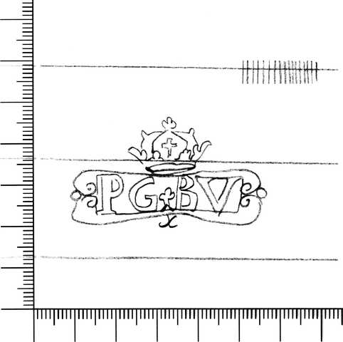 Tipo de filigrana: Sencilla Parte estudiada: Toda la filigrana Código del Motivo: V.04.00.00 Descripción: Letras PG / BV dentro de una cartela. Estructura: Tradicional de líneas Altura (mm): 48 Anchura (mm): Tipo de papel: Vitela Posición en la hoja: Izquierda centro Nº de corondeles en la hoja: 10 Distancia entre corondeles: Situada entre el corondel 3 y el corondel 5 Posición en relación al texto: Perpendicular al texto hacia abajo Origen de los datos: Datos obtenidos del original Información adicional: Son visibles las puntadas que unen la filigrana a la verjura. Estado de la hoja: Cortados todos los bordes Altura de la hoja: 332 Anchura de la hoja: 224 Color de la hoja: Natural Estado de conservación: Bueno Institución: Archivo del Monasterio de Sant Pere de les Puel·les -AMSP-, Barcelona