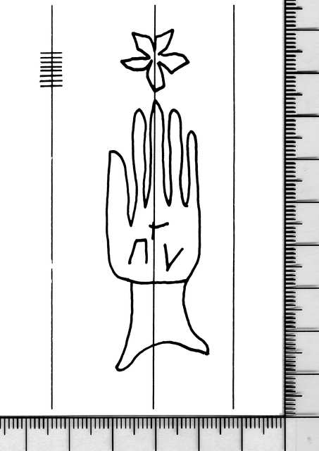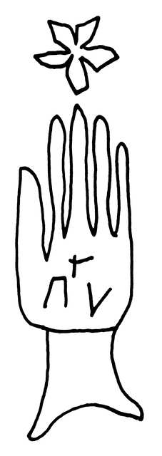 Tipo de filigrana: Sencilla Parte estudiada: Toda la filigrana Código del Motivo: B.02.02.03 Descripción: Mano con cuatro dedos juntos y pulgar separado. Encima, una flor de seis pétalos. Estructura: Tradicional de líneas Altura (mm): 106 Anchura (mm): Tipo de papel: Vitela Posición en la hoja: Izquierda centro Nº de corondeles en la hoja: 13 Distancia entre corondeles: Situada entre el corondel 4 y el corondel 6 Posición en relación al texto: Perpendicular al texto hacia abajo Origen de los datos: Datos obtenidos del original Información adicional: Son visibles las puntadas que unen la filigrana a la verjura. Estado de la hoja: Cortados todos los bordes Altura de la hoja: 330 Anchura de la hoja: 425 Color de la hoja: Natural Estado de conservación: Bueno Institución: Archivo del Monasterio de Sant Pere de les Puel·les -AMSP-, Barcelona