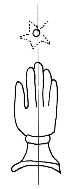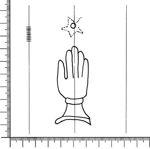 Tipo de filigrana: Sencilla Parte estudiada: Toda la filigrana Código del Motivo: B.02.02.02 Descripción: Mano con cuatro dedos juntos y el pulgar separado. Encima, una estrella de cinco puntas. Estructura: Tradicional de líneas Altura (mm): 87 Anchura (mm): 29 Tipo de papel: Verjurado Posición en la hoja: Derecha centro Nº de corondeles en la hoja: 5 Distancia entre corondeles: 33-38-(36)-(39)-37-22 (de la hoja Lxxxxviii(r Situada entre el corondel 2 y el corondel 4 Posición en relación al texto: Perpendicular al texto hacia arriba Origen de los datos: Datos obtenidos del original Información adicional: Se toma el número de corondeles de la hoja en la que se encuentra la filigrana. Autor de los datos de este registro: María Dolores Díaz de Miranda Macías Tipo de uso: Papel para imprimir Estado de la hoja: Cortados todos los bordes Altura de la hoja: 283 Anchura de la hoja: 410 Color de la hoja: Natural Estado de conservación: Restaurado (manualmente) Información adicional: Buen encolado. Institución: Biblioteca del Monasterio de Montserrat (BM)