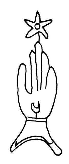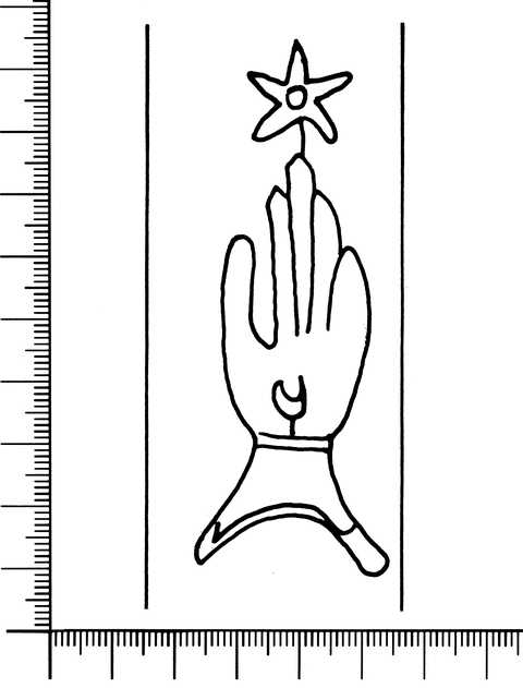 Tipo de filigrana: Sencilla Parte estudiada: Toda la filigrana Código del Motivo: B.02.04.05 Descripción: Mano con cuatro dedos juntos y el pulgar separado. Encima, una flor de cinco puntas. Dentro, medialuna. Estructura: Tradicional de líneas Altura (mm): 88 Anchura (mm): 30 Tipo de papel: Verjurado Posición en la hoja: Derecha centro Nº de corondeles en la hoja: 6 Distancia entre corondeles: 23-39-(40)-40-38-15-10 (de la 'hoja de respeto v') Situada entre el corondel 2 y el corondel 3 Posición en relación al texto: Perpendicular al texto hacia abajo Origen de los datos: Datos obtenidos del original Información adicional: Se toma el número de corondeles de la hoja en la que se encuentra la filigrana. Autor de los datos de este registro: María Dolores Díaz de Miranda Macías Tipo de uso: Papel para imprimir Estado de la hoja: Cortados todos los bordes Altura de la hoja: 283 Anchura de la hoja: 410 Color de la hoja: Natural Estado de conservación: Bueno Información adicional: Buen encolado. Institución: Biblioteca del Monasterio de Montserrat (BM)