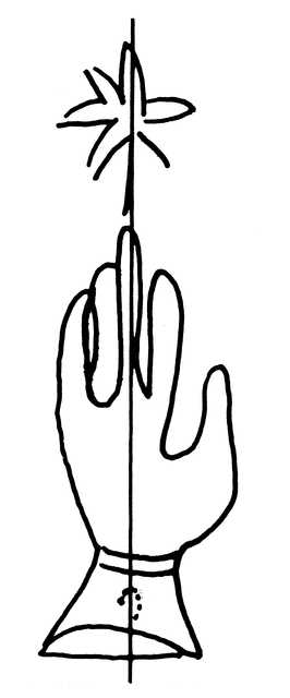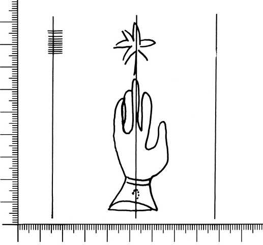 Tipo de filigrana: Sencilla Parte estudiada: Toda la filigrana Código del Motivo: B.02.02.03 Descripción: Mano con cuatro dedos juntos y el pulgar separado. Encima, estrella de seis puntas. Estructura: Tradicional de líneas Altura (mm): 85 Anchura (mm): 27 Tipo de papel: Verjurado Posición en la hoja: Izquierda centro Nº de corondeles en la hoja: 6 Distancia entre corondeles: 25-38-(38)-(38)-38-38-31 (de la hoja Lxxi(v) Situada entre el corondel 2 y el corondel 4 Posición en relación al texto: Perpendicular al texto hacia arriba Origen de los datos: Datos obtenidos del original Información adicional: Se toma el número de corondeles de la hoja en la que se encuentra la filigrana. Autor de los datos de este registro: María Dolores Díaz de Miranda Macías Tipo de uso: Papel para imprimir Estado de la hoja: Cortados todos los bordes Altura de la hoja: 291 Anchura de la hoja: 208 Color de la hoja: Natural Estado de conservación: Bueno Información adicional: Buen encolado. Institución: Biblioteca del Monasterio de Montserrat (BM)