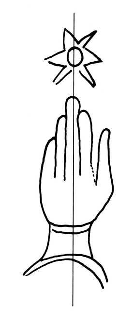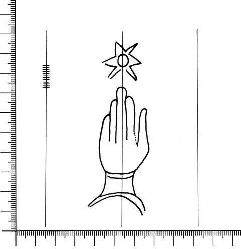 Tipo de filigrana: Sencilla Parte estudiada: Toda la filigrana Código del Motivo: B.02.02.03 Descripción: Mano con cuatro dedos juntos y pulgar separado. Encima, estrella de seis puntas. Estructura: Tradicional de líneas Altura (mm): 88 Anchura (mm): 29 Tipo de papel: Verjurado Posición en la hoja: Derecha centro Nº de corondeles en la hoja: 11 Distancia entre corondeles: 11-38-38-39-39-38-39-39-(39)-(39)-38-10 Situada entre el corondel 8 y el corondel 10 Posición en relación al texto: Perpendicular al texto hacia arriba Origen de los datos: Datos obtenidos del original Otros folios o signaturas del documento donde aparece la filigrana: Todo el libro contiene las filigranas 000529 y 000530. Autor de los datos de este registro: María Dolores Díaz de Miranda Macías Tipo de uso: Papel para imprimir Estado de la hoja: Cortados todos los bordes Altura de la hoja: 282 Anchura de la hoja: 407 Color de la hoja: Natural Estado de conservación: Bueno Institución: Biblioteca del Monasterio de Montserrat (BM)