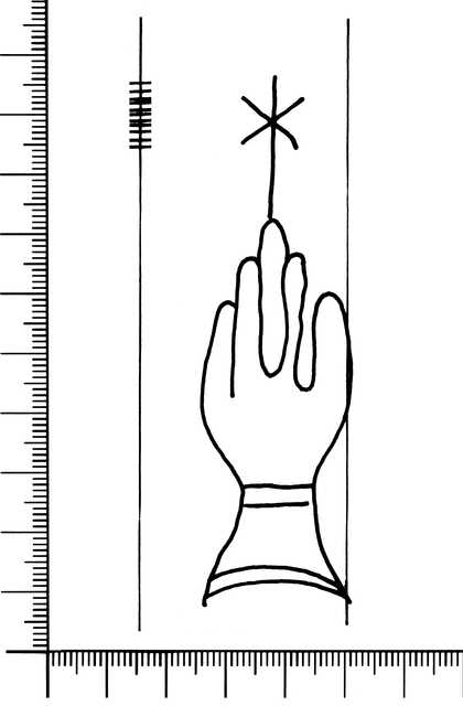 Tipo de filigrana: Sencilla Parte estudiada: Toda la filigrana Código del Motivo: B.02.02.04 Descripción: Mano con cuatro dedos juntos y pulgar separado. Encima, un aspa. Estructura: Tradicional de líneas Altura (mm): 90 Anchura (mm): 25 Tipo de papel: Verjurado Posición en la hoja: Derecha centro Nº de corondeles en la hoja: 13 Distancia entre corondeles: Situada entre el corondel 9 y el corondel 10 Posición en relación al texto: Perpendicular al texto hacia arriba Origen de los datos: Datos obtenidos del original Autor de los datos de este registro: María Dolores Díaz de Miranda Macías Tipo de uso: Papel para imprimir Estado de la hoja: Cortados todos los bordes Altura de la hoja: 295 Anchura de la hoja: 429 Color de la hoja: Natural Estado de conservación: Restaurado Institución: Biblioteca Pública de Gerona.