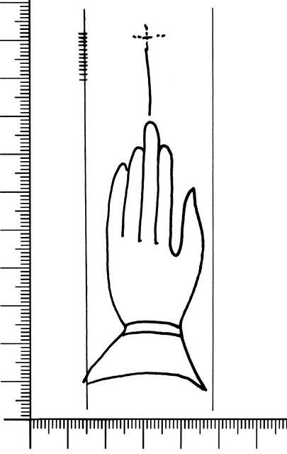 Tipo de filigrana: Sencilla Parte estudiada: Toda la filigrana Código del Motivo: B.02.02.04 Descripción: Mano con cuatro dedos juntos y el pulgar separado. Encima, una cruz. Estructura: Tradicional de líneas Altura (mm): [97] Anchura (mm): 33 Tipo de papel: Verjurado Posición en la hoja: Derecha centro Nº de corondeles en la hoja: 13 Distancia entre corondeles: Situada entre el corondel 9 y el corondel 10 Posición en relación al texto: Perpendicular al texto hacia arriba Origen de los datos: Datos obtenidos del original Autor de los datos de este registro: María Dolores Díaz de Miranda Macías Tipo de uso: Papel para imprimir Estado de la hoja: Cortados todos los bordes Altura de la hoja: 295 Anchura de la hoja: 426 Color de la hoja: Natural Estado de conservación: Restaurado Información adicional: Papel con mucha oxidación. Institución: Biblioteca Pública de Gerona.