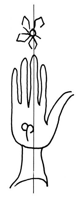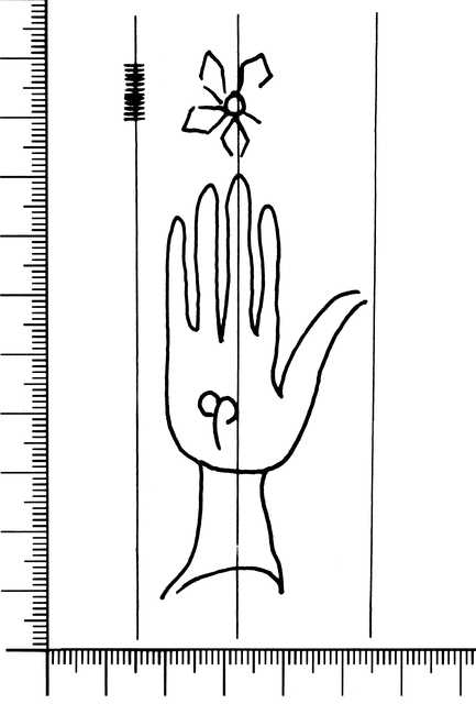 Tipo de filigrana: Sencilla Parte estudiada: Toda la filigrana Código del Motivo: B.01.05.00 Descripción: Mano con los cinco dedos abiertos. Encima, una flor de cinco pétalos. Dentro, un motivo no identificado. Estructura: Tradicional de líneas Altura (mm): 94 Anchura (mm): 35 Tipo de papel: Verjurado Posición en la hoja: Izquierda centro Nº de corondeles en la hoja: 13 Distancia entre corondeles: Situada entre el corondel 3 y el corondel 5 Posición en relación al texto: Perpendicular al texto hacia abajo Origen de los datos: Datos obtenidos del original Autor de los datos de este registro: María Dolores Díaz de Miranda Macías Tipo de uso: Papel para imprimir Estado de la hoja: Cortados todos los bordes Altura de la hoja: 295 Anchura de la hoja: 426 Color de la hoja: Natural Estado de conservación: Restaurado Institución: Biblioteca Pública de Gerona.