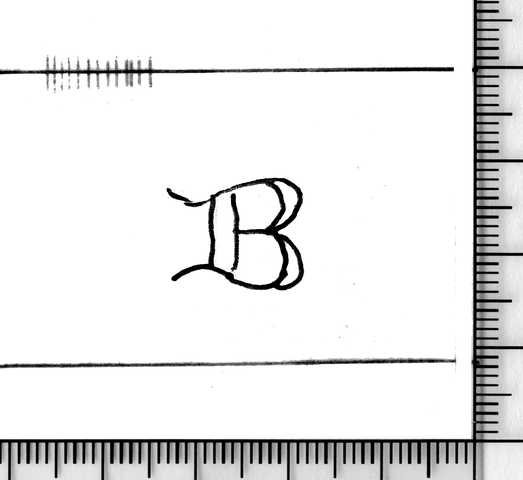 Tipo de filigrana: Sencilla Parte estudiada: Toda la filigrana Código del Motivo: V.01.02.00 Descripción: Letra B. Estructura: Tradicional de líneas Altura (mm): 12 Anchura (mm): 15 Tipo de papel: Verjurado Posición en la hoja: Izquierda superior Nº de corondeles en la hoja: 7 Distancia entre corondeles: 2-23-(31)-32-31-33-32-12 Situada entre el corondel 2 y el corondel 3 Posición en relación al texto: Paralelo al texto en el mismo sentido Origen de los datos: Datos obtenidos del original Información adicional: Filigrana horizontal. Autor de los datos de este registro: María Dolores Díaz de Miranda Macías Estado de la hoja: Cortados todos los bordes Altura de la hoja: 277-281 Anchura de la hoja: 196-198 Color de la hoja: Natural Estado de conservación: Restaurado Institución: Biblioteca Pública de Gerona -BPG-