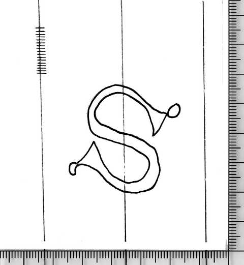 Tipo de filigrana: Sencilla Parte estudiada: Toda la filigrana Código del Motivo: V.01.20.00 Descripción: Letra S. Estructura: Tradicional de líneas Altura (mm): 38 Anchura (mm): 39 Tipo de papel: Verjurado Posición en la hoja: Izquierda centro Nº de corondeles en la hoja: 13 Distancia entre corondeles: 8-33-36-(27)-(28)-34-34-35-34-32-33-34-33-10 Situada entre el corondel 4 y el corondel 5 Posición en relación al texto: Perpendicular al texto hacia arriba Origen de los datos: Datos obtenidos del original País de localizatión del molino: Italia Autor de los datos de este registro: María Dolores Díaz de Miranda Macías Estado de la hoja: Cortados todos los bordes Altura de la hoja: 260-268 Anchura de la hoja: 406-411 Color de la hoja: Natural Estado de conservación: Restaurado Institución: Biblioteca Pública de Gerona -BPG-