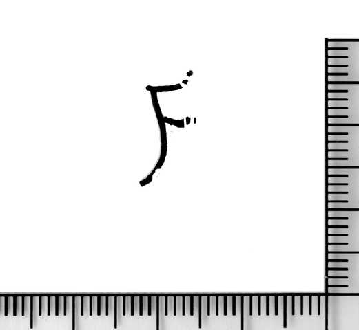 Tipo de filigrana: Sencilla Parte estudiada: Toda la filigrana Código del Motivo: V.01.06.00 Descripción: Letra F. Estructura: Tradicional de líneas Altura (mm): 13 Anchura (mm): 7 Tipo de papel: Verjurado Posición en la hoja: Derecha inferior Nº de corondeles en la hoja: 7 Distancia entre corondeles: 29-15-27-11-30-9-(21)-4 Situada entre el corondel 6 y el corondel 7 Posición en relación al texto: Paralelo al texto en el mismo sentido Origen de los datos: Datos obtenidos del original Autor de los datos de este registro: María Dolores Díaz de Miranda Macías Estado de la hoja: Cortados todos los bordes Altura de la hoja: 205 Anchura de la hoja: 183 Color de la hoja: Natural Estado de conservación: Restaurado (Datos tomados antes de restaurar) Institución: Biblioteca Pública de Lérida -BPL-