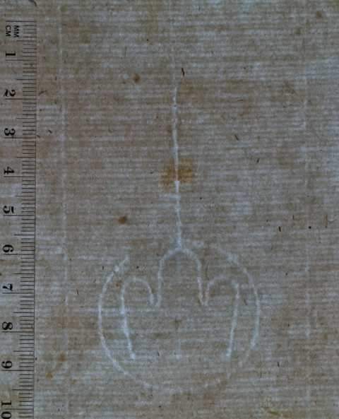 Tipo de filigrana: Sencilla Parte estudiada: Toda la filigrana Código del Motivo: H.01.06.02 Descripción: Monte de tres picos dentro de un círculo. Encima una cruz. Estructura: Tradicional de líneas Altura (mm): 79 Anchura (mm): 42 Tipo de papel: Verjurado Posición en la hoja: Derecha centro Nº de corondeles en la hoja: 12 Distancia entre corondeles: 28-36-37-37-37-37-37-36-(29)-(34)-37-37-28 Situada entre el corondel 8 y el corondel 10 Posición en relación al texto: Perpendicular al texto hacia arriba Origen de los datos: Datos obtenidos del original País de localizatión del molino: Italia Autor de los datos de este registro: María Dolores Díaz de Miranda Macías Estado de la hoja: Cortados todos los bordes Altura de la hoja: 303 Anchura de la hoja: 450 Color de la hoja: Natural Estado de conservación: Restaurado (Datos tomados antes de restaurar) Institución: Arxiu del Monestir de Sant Joan de les Abadesses.