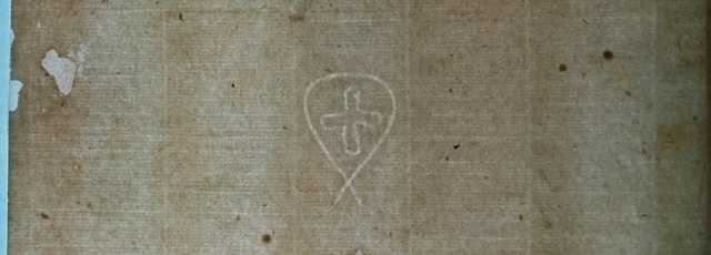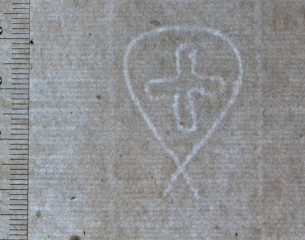 Tipo de filigrana: Sencilla Parte estudiada: Toda la filigrana Código del Motivo: S.01.03.01 Descripción: Cruz dentro de un círculo ovalado Estructura: Tradicional de líneas Altura (mm): 35 Anchura (mm): 24 Tipo de papel: Verjurado Posición en la hoja: Medio centro Nº de corondeles en la hoja: 5 Distancia entre corondeles: Situada entre el corondel 3 y el corondel 4 Posición en relación al texto: Perpendicular al texto hacia abajo Origen de los datos: Datos obtenidos del original País de localizatión del molino: Italia Autor de los datos de este registro: María Dolores Díaz de Miranda Macías Estado de la hoja: Fragmento Altura de la hoja: 271 Anchura de la hoja: 166 Color de la hoja: Natural Estado de conservación: Restaurado Institución: Biblioteca Pública Episcopal de Barcelona -BPEB-