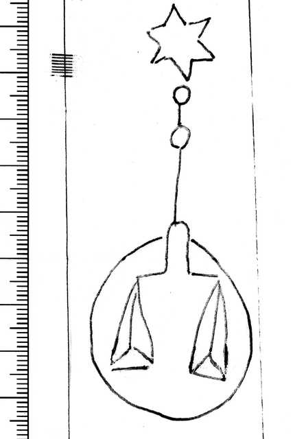 Tipo de filigrana: Sencilla Parte estudiada: Toda la filigrana Código del Motivo: N.01.03.01 Descripción: Balanza dentro de un círculo con platos planos. Encima una estrella de seis puntas Estructura: Tradicional de líneas Altura (mm): 91 Anchura (mm): 35 Tipo de papel: Verjurado Posición en la hoja: Medio centro Distancia entre corondeles: Posición en relación al texto: Paralelo al texto en sentido contrario Origen de los datos: Datos obtenidos del original Autor de los datos de este registro: María Dolores Díaz de Miranda Macías Estado de la hoja: Cortados todos los bordes Altura de la hoja: 287 Anchura de la hoja: 192 Color de la hoja: Natural Estado de conservación: Bueno Institución: Biblioteca Histórica del obispado de Teruel -BT-