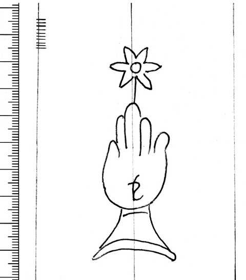 Tipo de filigrana: Sencilla Parte estudiada: Toda la filigrana Código del Motivo: B.02.04.05 Descripción: Mano con cuatro dedos juntos y el pulgar separado. Encima flor de seis pétalos y dentro letras entrelazadas Estructura: Tradicional de líneas Altura (mm): 81 Anchura (mm): 32 Tipo de papel: Verjurado Posición en la hoja: Medio centro Nº de corondeles en la hoja: 6 Distancia entre corondeles: 8-35-(36)-(37)-36-36-3 Situada entre el corondel 2 y el corondel 4 Posición en relación al texto: Origen de los datos: Datos obtenidos del original Autor de los datos de este registro: María Dolores Díaz de Miranda Macías Estado de la hoja: Cortados todos los bordes Altura de la hoja: 296 Anchura de la hoja: 191 Color de la hoja: Natural Estado de conservación: Bueno Institución: Biblioteca Histórica del obispado de Teruel -BT-