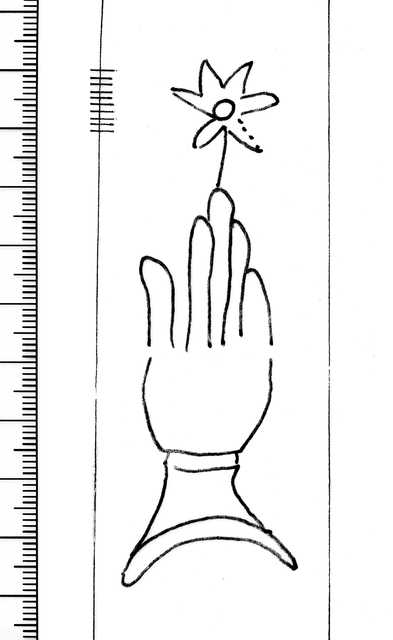 Tipo de filigrana: Sencilla Parte estudiada: Toda la filigrana Código del Motivo: B.02.02.03 Descripción: Mano con cuatro dedos juntos y el pulgar separado. Encima flor de seis pétalos Estructura: Tradicional de líneas Altura (mm): 91 Anchura (mm): 31 Tipo de papel: Verjurado Posición en la hoja: Medio centro Nº de corondeles en la hoja: 5 Distancia entre corondeles: 10-40-40-(40)-39-31 Situada entre el corondel 3 y el corondel 4 Posición en relación al texto: Origen de los datos: Datos obtenidos del original Autor de los datos de este registro: María Dolores Díaz de Miranda Macías Estado de la hoja: Cortados todos los bordes Altura de la hoja: 281 Anchura de la hoja: 200 Color de la hoja: Natural Estado de conservación: Bueno Institución: Biblioteca Histórica del obispado de Teruel -BT-