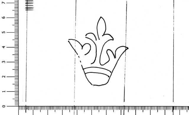 Tipo de filigrana: Sencilla Parte estudiada: Toda la filigrana Código del Motivo: R.01.01.01 Descripción: Corona con tres florones. (Uno es un florón entero y los otros dos son una mitad). Estructura: Tradicional de líneas Altura (mm): 47 Anchura (mm): 40 Tipo de papel: Verjurado Posición en la hoja: Derecha centro Nº de corondeles en la hoja: 17 Distancia entre corondeles: 9-34-33-34-34-34-33-33-[34]-[34]-34-35-(34)-(34)-(33)-34-33-17 Situada entre el corondel 12 y el corondel 15 Posición en relación al texto: Perpendicular al texto hacia arriba Origen de los datos: Datos obtenidos del original País de localizatión del molino: Alemania o Francia Autor de los datos de este registro: María Dolores Díaz de Miranda Macías Estado de la hoja: Cortados todos los bordes Altura de la hoja: 414 Anchura de la hoja: 566 Color de la hoja: Natural Institución: Biblioteca Histórica del obispado de Teruel -BT-