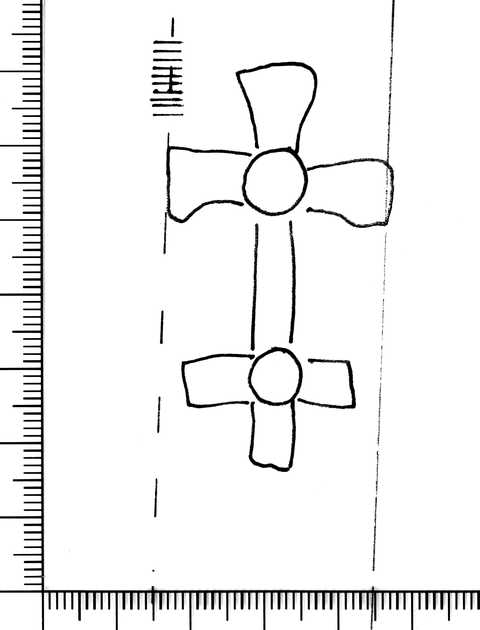 Tipo de filigrana: Sencilla Parte estudiada: Toda la filigrana Código del Motivo: S.01.07.00 Descripción: Cruz de dos brazos o de Lorena. Cruz con dos brazos paralelos en los extremos y de dimensiones iguales, en el interior de la confluencia de los brazos se traza un círculo. Estructura: Tradicional de líneas Altura (mm): 55 Anchura (mm): 31 Tipo de papel: Verjurado Posición en la hoja: Izquierda centro Nº de corondeles en la hoja: 19 Distancia entre corondeles: 8-29-31-30-30-(30)-30-31-29-29-29-30-29-29-31-29-30-29-28-26 Situada entre el corondel 5 y el corondel 6 Posición en relación al texto: Perpendicular al texto hacia arriba Origen de los datos: Datos obtenidos del original País de localizatión del molino: Italia (según Briquet) Lugar del molino: Piamonte (según Briquet) Autor de los datos de este registro: María Dolores Díaz de Miranda Macías Estado de la hoja: Cortados todos los bordes Altura de la hoja: 409 Anchura de la hoja: 567 Color de la hoja: Natural Institución: Biblioteca Histórica del obispado de Teruel -BT-