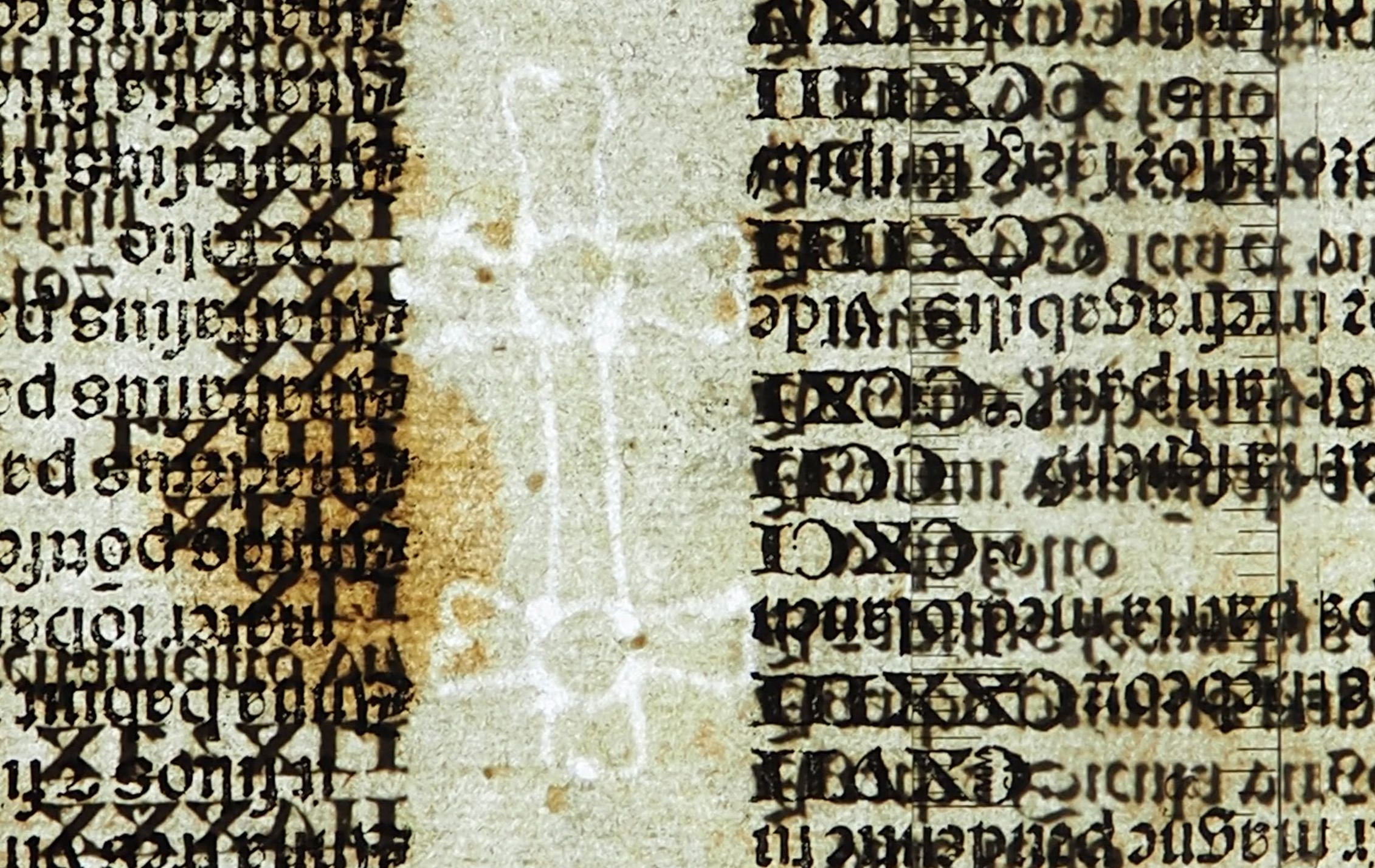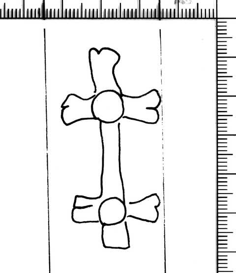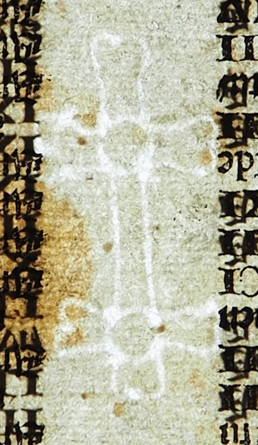 Tipo de filigrana: Sencilla Parte estudiada: Toda la filigrana Código del Motivo: S.01.07.00 Descripción: Cruz de dos brazos o de Lorena. Cruz con dos brazos paralelos en los extremos y de dimensiones iguales, en el interior de la confluencia de los brazos se traza un círculo. Estructura: Tradicional de líneas Altura (mm): 52 Anchura (mm): 26 Tipo de papel: Verjurado Posición en la hoja: Derecha centro Nº de corondeles en la hoja: 18 Distancia entre corondeles: 20-32-31-29-30-30-28-31-28-30-30-30-30-30-(30)-30-29-30-21-9 Situada entre el corondel 14 y el corondel 15 Posición en relación al texto: Perpendicular al texto hacia abajo Origen de los datos: Datos obtenidos del original Información adicional: Filigrana idéntica a la 000891 País de localizatión del molino: Italia (según Briquet) Lugar del molino: Piamonte (según Briquet) Autor de los datos de este registro: María Dolores Díaz de Miranda Macías Estado de la hoja: Cortados todos los bordes Altura de la hoja: 407 Anchura de la hoja: 558 Color de la hoja: Natural Institución: Biblioteca Histórica del obispado de Teruel -BT-