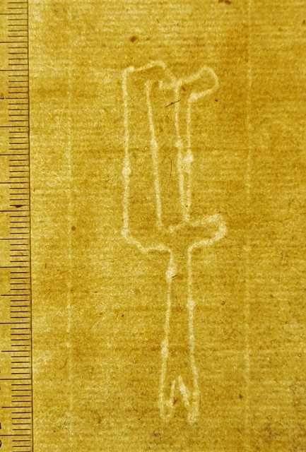 Tipo de filigrana: Sencilla Parte estudiada: Toda la filigrana Código del Motivo: V.01.17.00 Descripción: Letra gótica “p” sencilla, sin ningún motivo secundario. El eje vertical se bifurca en la parte inferior (los pies) y el horizontal atraviesa por delante al vertical sobrepasándolo. El inicio del trazo horizontal está separado del vertical. Estructura: Tradicional de líneas Altura (mm): 66 Anchura (mm): 18 Tipo de papel: 20 Posición en la hoja: Derecha centro Distancia entre corondeles: Situada entre el corondel 14 y el corondel 15 Posición en relación al texto: Perpendicular al texto hacia arriba Origen de los datos: Datos obtenidos del original País de localizatión del molino: Alemania o Francia Autor de los datos de este registro: María Dolores Díaz de Miranda Macías Estado de la hoja: Cortados todos los bordes Altura de la hoja: 413 Anchura de la hoja: 565 Color de la hoja: Natural Estado de conservación: Restaurado pH del papel: Verjurado Institución: I-25/BT. (Antigua 30-31)