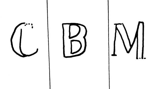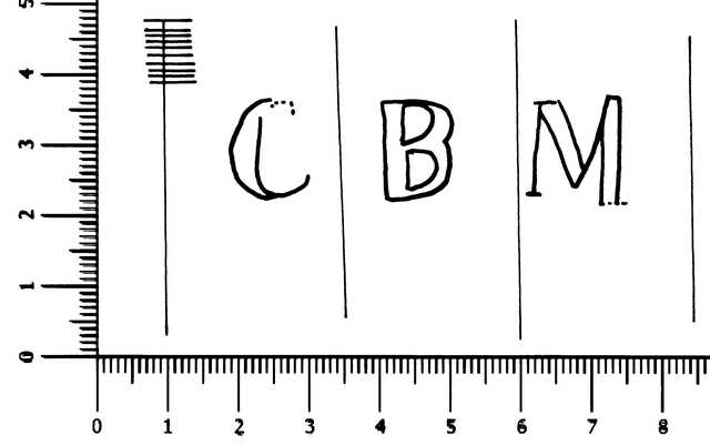 Tipo de filigrana: Sencilla Parte estudiada: Toda la filigrana Código del Motivo: V.03.00.00 Descripción: Letras CBM. Estructura: Tradicional de líneas Altura (mm): 15 Anchura (mm): 56 Tipo de papel: Verjurado Posición en la hoja: Medio centro Nº de corondeles en la hoja: 9 Distancia entre corondeles: Situada entre el corondel 4 y el corondel 7 Posición en relación al texto: Origen de los datos: Datos obtenidos del original País de localizatión del molino: España Autor de los datos de este registro: María Dolores Díaz de Miranda Macías y Ana María Herrero Montero Tipo de uso: Papel sellado Estado de la hoja: Cortado borde izquierdo y superior Altura de la hoja: 300 Anchura de la hoja: 206 Color de la hoja: Natural Información adicional: Papel timbrado de 1808 con la anotaciOn de “valga 8 mrs. por de oficio para el año de 1812”. Institución: Archivo Municipal de Oviedo.