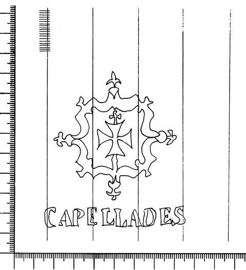 Tipo de filigrana: Sencilla Parte estudiada: Toda la filigrana Código del Motivo: T.02.15.03 Descripción: Escudo con la cruz de Malta en su interior. En la base CAPELLADES. Estructura: Tradicional de líneas Altura (mm): 77 Anchura (mm): 20 Tipo de papel: Verjurado Posición en la hoja: Derecha centro Nº de corondeles en la hoja: 19 Distancia entre corondeles: Situada entre el corondel 12 y el corondel 17 Posición en relación al texto: Origen de los datos: Datos obtenidos del original Otros folios o signaturas del documento donde aparece la filigrana: Folios 445 y 448-449 de este mismo libro. País de localizatión del molino: España Lugar del molino: Capellades, Barcelona. Fabricante: Serra Autor de los datos de este registro: María Dolores Díaz de Miranda Macías y Ana María Herrero Montero Tipo de uso: Papel para imprimir Estado de la hoja: Cortado borde izquierdo Altura de la hoja: 313 Anchura de la hoja: 431 Color de la hoja: Natural Institución: Archivo Municipal de Oviedo.
