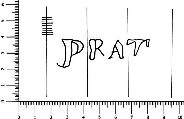 Tipo de filigrana: Sencilla Parte estudiada: Toda la filigrana Código del Motivo: W.02.01.00 Descripción: Letras PRAT. Estructura: Tradicional de líneas Altura (mm): 18 Anchura (mm): 58 Tipo de papel: Verjurado Posición en la hoja: Izquierda superior Nº de corondeles en la hoja: 9 Distancia entre corondeles: Situada entre el corondel 2 y el corondel 5 Posición en relación al texto: Origen de los datos: Datos obtenidos del original Otros folios o signaturas del documento donde aparece la filigrana: Folios 370-373, 371-372, 374-377, 375-376, 378-379, 380-381 y 433 de este mismo libro. Fabricante: Prat o Prats. Autor de los datos de este registro: María Dolores Díaz de Miranda Macías y Ana María Herrero Montero Tipo de uso: Papel para imprimir Estado de la hoja: Cortados todos los bordes Altura de la hoja: 306 Anchura de la hoja: 204 Color de la hoja: Natural Institución: Archivo Municipal de Oviedo.