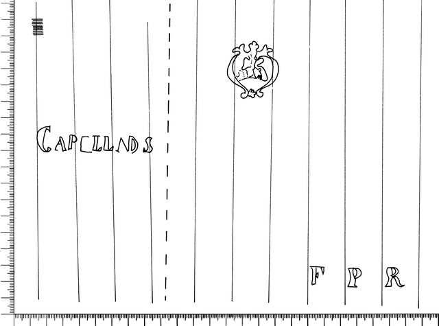 Tipo de filigrana: Contramarca Parte estudiada: Derecha Código del Motivo: T.03.99.00 Descripción: Filigrana doble con contramarca. Filigrana izquierda: CAPELLADS. Filigrana central: Escudo no identificado. Filigrana derecha: iniciasles FPR. Estructura: Tradicional de líneas Altura (mm): 36 Anchura (mm): 31 Tipo de papel: Verjurado Posición en la hoja: Derecha centro Nº de corondeles en la hoja: 19 Distancia entre corondeles: Situada entre el corondel 13 y el corondel 16 Posición en relación al texto: Origen de los datos: Datos obtenidos del original País de localizatión del molino: España Lugar del molino: Cataluña. Fabricante: Filip Romaní Autor de los datos de este registro: María Dolores Díaz de Miranda Macías y Ana María Herrero Montero Tipo de uso: Papel para imprimir Estado de la hoja: Cortados todos los bordes Altura de la hoja: 310 Anchura de la hoja: 435 Color de la hoja: Natural Institución: Archivo Municipal de Oviedo.