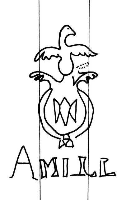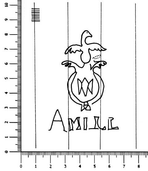 Tipo de filigrana: Sencilla Parte estudiada: Toda la filigrana Código del Motivo: T.02.15.09 Descripción: Monograma de María dentro de un doble círculo, abierto en la parte superior y sobre éste una paloma; en los pies el nombre AMILL. Estructura: Tradicional de líneas Altura (mm): 70 Anchura (mm): 48 Tipo de papel: Verjurado Posición en la hoja: Derecha centro Nº de corondeles en la hoja: 19 Distancia entre corondeles: Situada entre el corondel 13 y el corondel 16 Posición en relación al texto: Origen de los datos: Datos obtenidos del original País de localizatión del molino: España Lugar del molino: La Riba, Tarragona. Fabricante: Josep y Salvador Amill. Autor de los datos de este registro: María Dolores Díaz de Miranda Macías y Ana María Herrero Montero Tipo de uso: Papel para imprimir Estado de la hoja: Cortados todos los bordes Altura de la hoja: 298 Anchura de la hoja: 412 Color de la hoja: Natural Institución: Archivo Municipal de Oviedo.