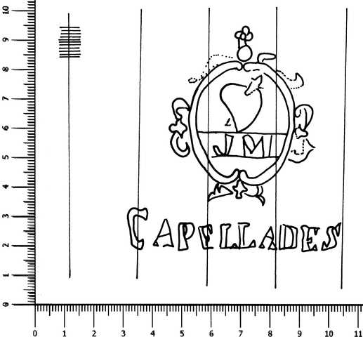 Tipo de filigrana: Sencilla Parte estudiada: Toda la filigrana Código del Motivo: T.02.15.99 Descripción: Escudo; en su interior corazOn traspasado por un puñal e iniciales JM; en la base CAPELLADES. Estructura: Tradicional de líneas Altura (mm): 75 Anchura (mm): 74 Tipo de papel: Verjurado Posición en la hoja: Izquierda centro Nº de corondeles en la hoja: 9 Distancia entre corondeles: Situada entre el corondel 2 y el corondel 6 Posición en relación al texto: Origen de los datos: Datos obtenidos del original País de localizatión del molino: España Lugar del molino: Capellades, Barcelona. Autor de los datos de este registro: María Dolores Díaz de Miranda Macías y Ana María Herrero Montero Tipo de uso: Papel para imprimir Estado de la hoja: Cortados todos los bordes Altura de la hoja: 309 Anchura de la hoja: 218 Color de la hoja: Natural Institución: Archivo Municipal de Oviedo.