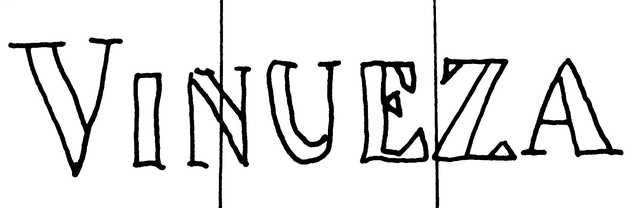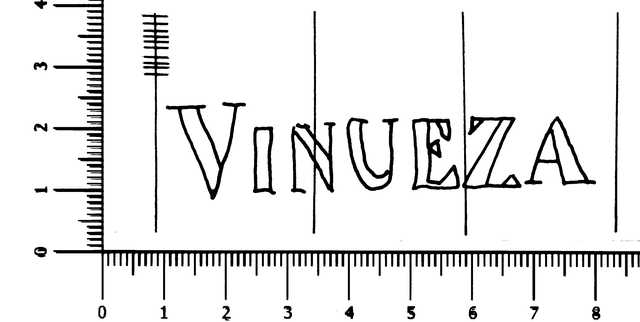 Tipo de filigrana: Sencilla Parte estudiada: Toda la filigrana Código del Motivo: W.03.00.00 Descripción: Letras: VINUEZA. Estructura: Tradicional de líneas Altura (mm): 16 Anchura (mm): 69 Tipo de papel: Verjurado Posición en la hoja: Derecha centro Nº de corondeles en la hoja: 18 Distancia entre corondeles: Distancia media entre 25 y 26. Situada entre el corondel 12 y el corondel 15 Posición en relación al texto: Origen de los datos: Datos obtenidos del original Otros folios o signaturas del documento donde aparece la filigrana: folio 347-348 (quizá filigrana gemela). País de localizatión del molino: España Lugar del molino: Vinuesa, Soria. Fabricante: D.J.C. Autor de los datos de este registro: María Dolores Díaz de Miranda Macías y Ana María Herrero Montero Tipo de uso: Papel para imprimir Estado de la hoja: Cortados todos los bordes Altura de la hoja: 299 Anchura de la hoja: 412 Color de la hoja: Natural Institución: Archivo Municipal de Oviedo.