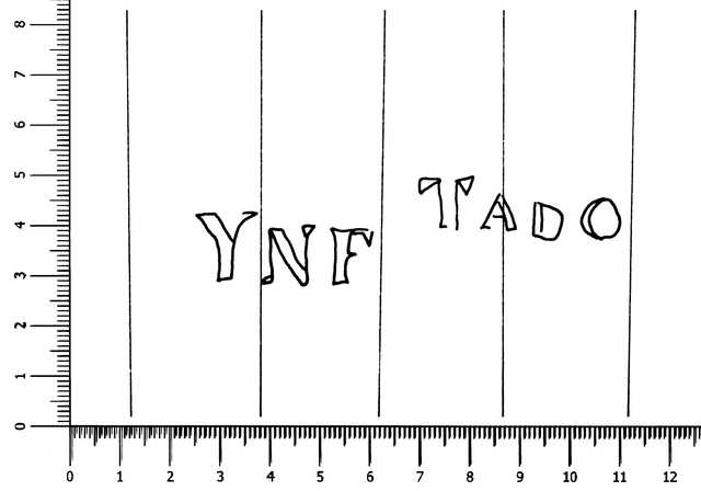 Tipo de filigrana: Doble Parte estudiada: Derecha Código del Motivo: W.99.00.00 Descripción: Filigrana doble. Filigrana izquierda: letras PAST NA. Filigrana derecha: letras YNF TADO. Estructura: Tradicional de líneas Altura (mm): 21 Anchura (mm): 85 Tipo de papel: Verjurado Posición en la hoja: Derecha centro Nº de corondeles en la hoja: 19 Distancia entre corondeles: Situada entre el corondel 10 y el corondel 14 Posición en relación al texto: Origen de los datos: Datos obtenidos del original País de localizatión del molino: España Lugar del molino: Pastrana, Guadalajara. Nombre del molino: Nombre del molino Infantado Fabricante: Fábrica de Infantado. Tipo de uso: Papel para escribir Estado de la hoja: Cortados todos los bordes Altura de la hoja: 319 Anchura de la hoja: 444 Color de la hoja: Natural Institución: Archivo Municipal de Oviedo.