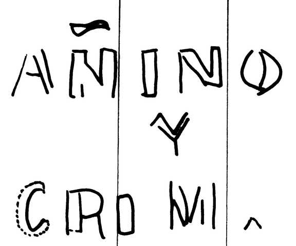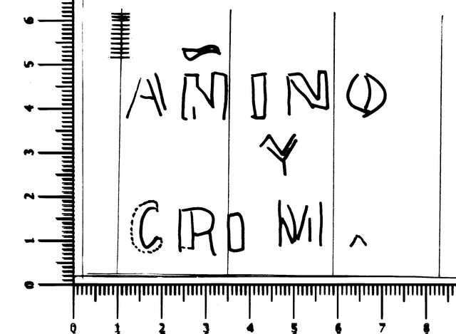 Tipo de filigrana: Sencilla Parte estudiada: Toda la filigrana Código del Motivo: W.02.01.00 Descripción: Letras AÑINO Y GRIMAUD. Estructura: Tradicional de líneas Altura (mm): 47 Anchura (mm): 59 Tipo de papel: Verjurado Posición en la hoja: Izquierda centro Nº de corondeles en la hoja: 17 Distancia entre corondeles: Situada entre el corondel 3 y el corondel 6 Posición en relación al texto: Origen de los datos: Datos obtenidos del original País de localizatión del molino: España Lugar del molino: Cuenca. Fabricante: Añino y Grinaud. Autor de los datos de este registro: María Dolores Díaz de Miranda Macías y Ana María Herrero Montero Tipo de uso: Papel para escribir Estado de la hoja: Cortados todos los bordes Altura de la hoja: 292 Anchura de la hoja: 402 Color de la hoja: Natural Estado de conservación: Restaurado Información adicional: El color de la hoja, Natural, no ha sufrido ninguna manipulación para cambiar sustancialmente el color natural de las fibras celulósicas; el leve lejiado de las fibras en la elaboración de la pulpa de papel lo consideramos una operación dentro del proceso de elaboración del papel. Institución: Archivo Municipal de Oviedo.