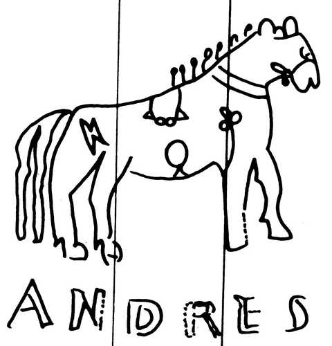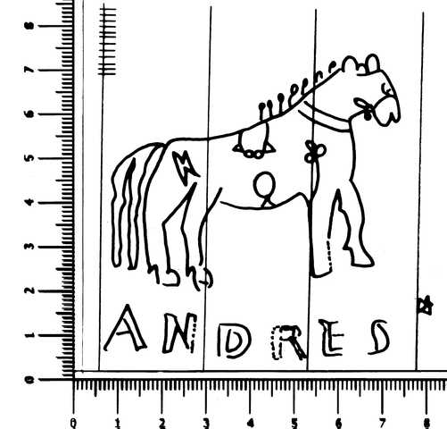 Tipo de filigrana: Sencilla Parte estudiada: Toda la filigrana Código del Motivo: C.02.01.00 Descripción: Caballo con ANDRES a los pies. Estructura: Tradicional de líneas Altura (mm): 68 Anchura (mm): 67 Tipo de papel: Verjurado Posición en la hoja: Medio centro Nº de corondeles en la hoja: 8 Distancia entre corondeles: Situada entre el corondel 3 y el corondel 6 Posición en relación al texto: Origen de los datos: Datos obtenidos del original País de localizatión del molino: España Lugar del molino: Segovia. Fabricante: Andrés Casaban Autor de los datos de este registro: María Dolores Díaz de Miranda Macías y Ana María Herrero Montero Tipo de uso: Papel para escribir Estado de la hoja: Cortados todos los bordes Altura de la hoja: 293 Anchura de la hoja: 196 Color de la hoja: Natural Estado de conservación: Restaurado Información adicional: El color de la hoja, Natural, no ha sufrido ninguna manipulación para cambiar sustancialmente el color natural de las fibras celulósicas; el leve lejiado de las fibras en la elaboración de la pulpa de papel lo consideramos una operación dentro del proceso de elaboración del papel. Institución: Archivo Municipal de Oviedo.