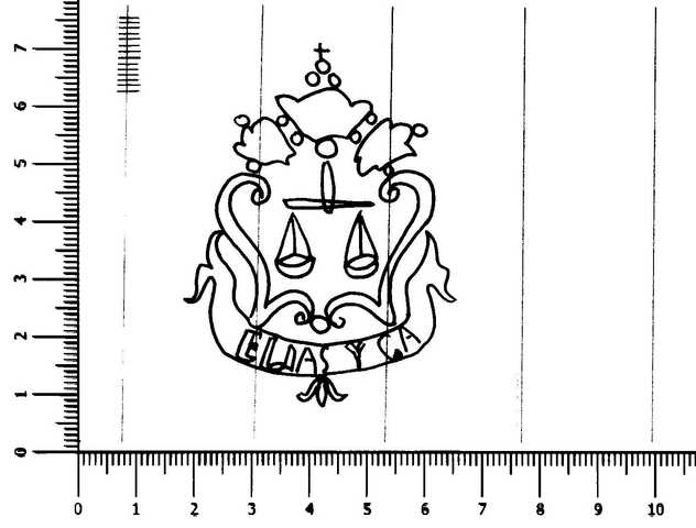 Tipo de filigrana: Sencilla Parte estudiada: Toda la filigrana Código del Motivo: T.02.10.01 Descripción: Escudo surmontado por una pequeña cruz, en el interior una balanza y a los pies: ELIAS Y CA. Estructura: Tradicional de líneas Altura (mm): 64 Anchura (mm): 48 Tipo de papel: Verjurado Posición en la hoja: Derecha centro Nº de corondeles en la hoja: 18 Distancia entre corondeles: Situada entre el corondel 13 y el corondel 16 Posición en relación al texto: Origen de los datos: Datos obtenidos del original País de localizatión del molino: España Lugar del molino: Gélida, Barcelona. Fabricante: Miquel Elías y Compañía. Autor de los datos de este registro: María Dolores Díaz de Miranda Macías y Ana María Herrero Montero Tipo de uso: Papel para escribir Estado de la hoja: Cortados todos los bordes Altura de la hoja: 294 Anchura de la hoja: 410 Color de la hoja: Natural Institución: Archivo Municipal de Oviedo.