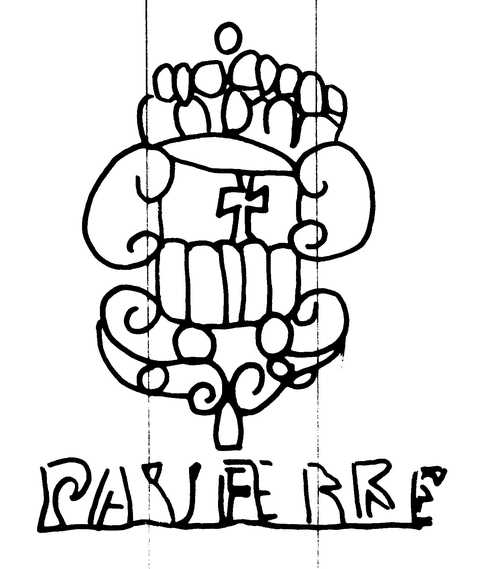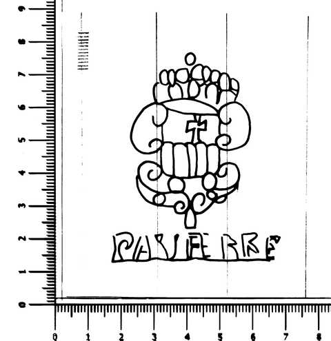 Tipo de filigrana: Sencilla Parte estudiada: Toda la filigrana Código del Motivo: T.04.06.01 Descripción: Escudo de la Merced, a los pies PAU FERRE. Estructura: Tradicional de líneas Altura (mm): 63 Anchura (mm): 51 Tipo de papel: Verjurado Posición en la hoja: Derecha centro Nº de corondeles en la hoja: 19 Distancia entre corondeles: Situada entre el corondel 14 y el corondel 17 Posición en relación al texto: Origen de los datos: Datos obtenidos del original País de localizatión del molino: España Lugar del molino: Cardona, Barcelona. Fabricante: Pau Ferrer Autor de los datos de este registro: María Dolores Díaz de Miranda Macías y Ana María Herrero Montero Tipo de uso: Papel sellado Estado de la hoja: Cortado borde derecho e inferior Altura de la hoja: 298 Anchura de la hoja: 416 Color de la hoja: Natural Estado de conservación: Restaurado Información adicional: El color de la hoja, Natural, no ha sufrido ninguna manipulación para cambiar sustancialmente el color natural de las fibras celulósicas; el leve lejiado de las fibras en la elaboración de la pulpa de papel lo consideramos una operación dentro del proceso de elaboración del papel. Institución: Archivo Municipal de Oviedo.