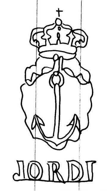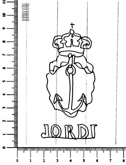 Tipo de filigrana: Sencilla Parte estudiada: Toda la filigrana Código del Motivo: T.02.10.06 Descripción: Escudo coronado; en su interior un ancla y a los pies las letras JORDI. Estructura: Tradicional de líneas Altura (mm): 89 Anchura (mm): 42 Tipo de papel: Verjurado Posición en la hoja: Derecha centro Nº de corondeles en la hoja: 18 Distancia entre corondeles: Situada entre el corondel 12 y el corondel 15 Posición en relación al texto: Origen de los datos: Datos obtenidos del original País de localizatión del molino: España Lugar del molino: Ripollet o Sant Sadurní d’Anoia, Barcelona. Fabricante: Joan Ignasi Jordi Autor de los datos de este registro: María Dolores Díaz de Miranda Macías y Ana María Herrero Montero Tipo de uso: Papel para escribir Estado de la hoja: Cortados todos los bordes Altura de la hoja: 291 Anchura de la hoja: 394 Color de la hoja: Natural Institución: Archivo Municipal de Oviedo.