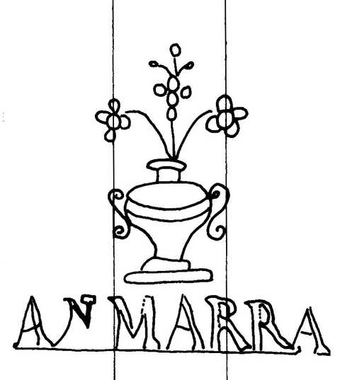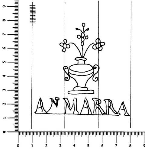 Tipo de filigrana: Sencilla Parte estudiada: Toda la filigrana Código del Motivo: P.03.01.02 Descripción: Jarrón con tres flores a los pies AN MARRA. Estructura: Tradicional de líneas Altura (mm): 66 Anchura (mm): 69 Tipo de papel: Verjurado Posición en la hoja: Izquierda centro Nº de corondeles en la hoja: 19 Distancia entre corondeles: Situada entre el corondel 2 y el corondel 5 Posición en relación al texto: Origen de los datos: Datos obtenidos del original País de localizatión del molino: España Lugar del molino: Capellades, Barcelona. Fabricante: Antoni Marra Autor de los datos de este registro: María Dolores Díaz de Miranda Macías y Ana María Herrero Montero Tipo de uso: Papel sellado Estado de la hoja: Cortados todos los bordes Altura de la hoja: 300 Anchura de la hoja: 430 Color de la hoja: Natural Institución: Archivo Municipal de Oviedo.