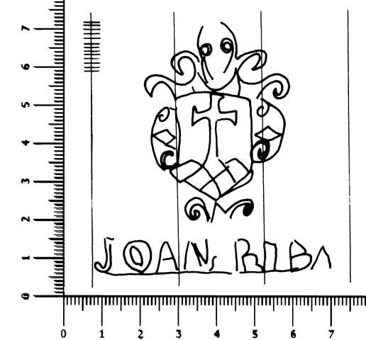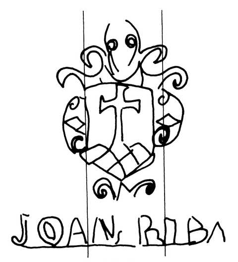 Tipo de filigrana: Sencilla Parte estudiada: Toda la filigrana Código del Motivo: T.02.15.01 Descripción: Escudo, en el interior cruz sobre montañas y en la base JOAN RIBA. Estructura: Tradicional de líneas Altura (mm): 68 Anchura (mm): 64 Tipo de papel: Verjurado Posición en la hoja: Derecha centro Nº de corondeles en la hoja: 17 Distancia entre corondeles: Situada entre el corondel 12 y el corondel 15 Posición en relación al texto: Origen de los datos: Datos obtenidos del original País de localizatión del molino: España Lugar del molino: Martorell o Monistrol, Barcelona. Fabricante: Joan Riba Autor de los datos de este registro: María Dolores Díaz de Miranda Macías y Ana María Herrero Montero Tipo de uso: Papel para escribir Estado de la hoja: Cortados todos los bordes Altura de la hoja: 294 Anchura de la hoja: 400 Color de la hoja: Natural Estado de conservación: Restaurado Información adicional: El color de la hoja, Natural, no ha sufrido ninguna manipulación para cambiar sustancialmente el color natural de las fibras celulósicas; el leve lejiado de las fibras en la elaboración de la pulpa de papel lo consideramos una operación dentro del proceso de elaboración del papel. Institución: Archivo Municipal de Oviedo.