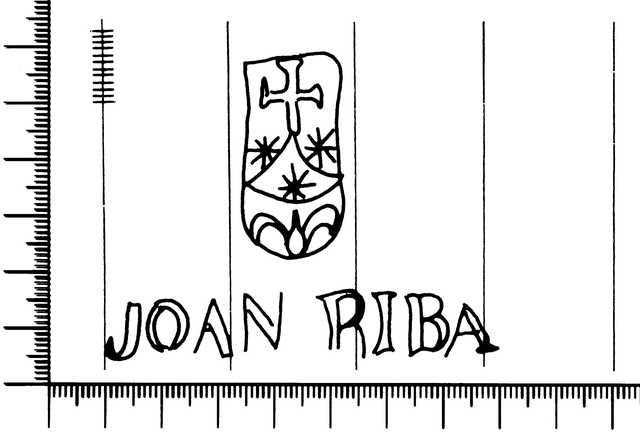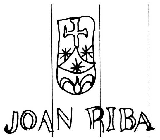 Tipo de filigrana: Sencilla Parte estudiada: Toda la filigrana Código del Motivo: T.04.06.02 Descripción: Escudo del Carmen en la base JOAN RIBA. Estructura: Tradicional de líneas Altura (mm): 54 Anchura (mm): 70 Tipo de papel: Verjurado Posición en la hoja: Derecha centro Nº de corondeles en la hoja: 18 Distancia entre corondeles: Situada entre el corondel 13 y el corondel 17 Posición en relación al texto: Origen de los datos: Datos obtenidos del original País de localizatión del molino: España Lugar del molino: Comarca de l'Anoia, Barcelona. Fabricante: Joan Riba Autor de los datos de este registro: María Dolores Díaz de Miranda Macías y Ana María Herrero Montero Tipo de uso: Papel para escribir Estado de la hoja: Cortados todos los bordes Altura de la hoja: 295 Anchura de la hoja: 410 Color de la hoja: Natural Estado de conservación: Restaurado Información adicional: El color de la hoja, Natural, no ha sufrido ninguna manipulación para cambiar sustancialmente el color natural de las fibras celulósicas; el leve lejiado de las fibras en la elaboración de la pulpa de papel lo consideramos una operación dentro del proceso de elaboración del papel. Institución: Archivo Municipal de Oviedo.