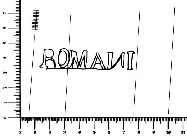 Tipo de filigrana: Doble Parte estudiada: Izquierda Código del Motivo: W.02.01.00 Descripción: Filigrana doble. Filigrana izquierda: ROMANI. Filigrana derecha: Letra R dentro de un escudo circular coronado. Estructura: Tradicional de líneas Altura (mm): 13 Anchura (mm): 63 Tipo de papel: Verjurado Posición en la hoja: Izquierda centro Nº de corondeles en la hoja: 18 Distancia entre corondeles: Situada entre el corondel 4 y el corondel 6 Posición en relación al texto: Origen de los datos: Datos obtenidos del original País de localizatión del molino: España Lugar del molino: Capellades, Barcelona. Fabricante: Romaní. Autor de los datos de este registro: María Dolores Díaz de Miranda Macías y Ana María Herrero Montero Tipo de uso: Papel para escribir Estado de la hoja: Cortados todos los bordes Altura de la hoja: 294 Anchura de la hoja: 418 Color de la hoja: Natural Estado de conservación: Restaurado Información adicional: El color de la hoja, Natural, no ha sufrido ninguna manipulación para cambiar sustancialmente el color natural de las fibras celulósicas; el leve lejiado de las fibras en la elaboración de la pulpa de papel lo consideramos una operación dentro del proceso de elaboración del papel. Institución: Archivo Municipal de Oviedo.